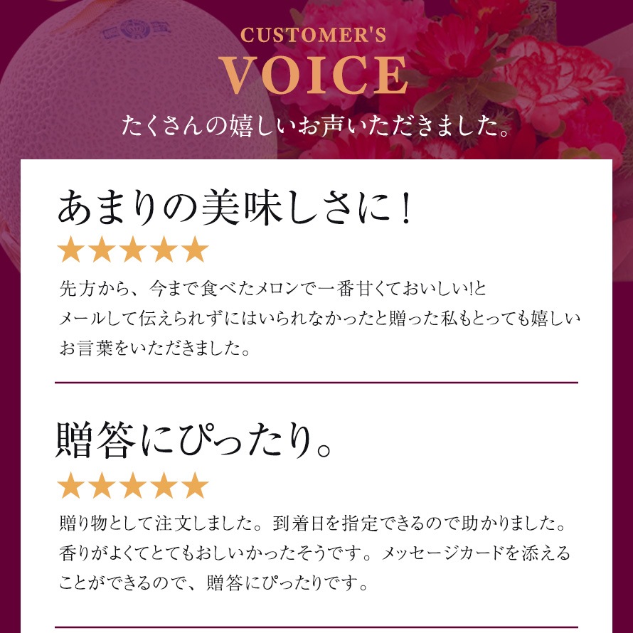 ※食べごろのメロンは柔らかく通常より割れやすいため、食べごろ当日や前日の到着は不可とさせていただきます。