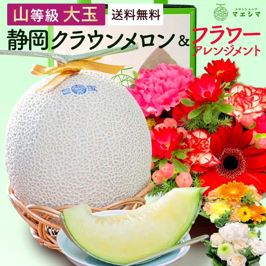 | 商品名 | クラウンメロン+フラワーアレンジメントセット 【上(山等級)】大玉(1.4kg前後)1玉入り |
