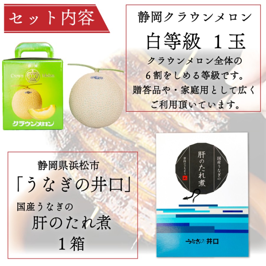 | 商品名 | クラウンメロン×国産うなぎ肝のたれ煮セット(クラウンメロン白等級1玉×国産うなぎ肝のたれ煮×1) |