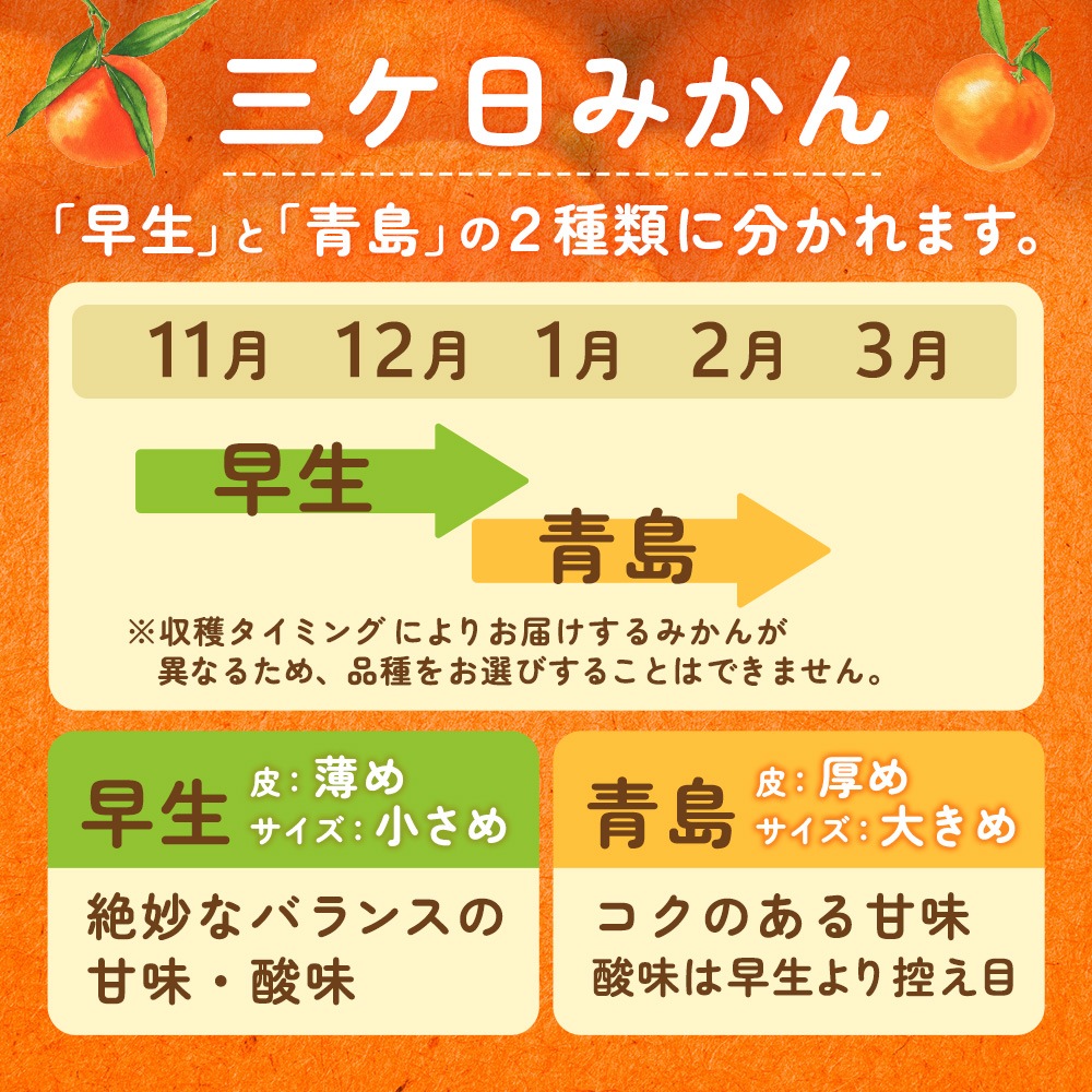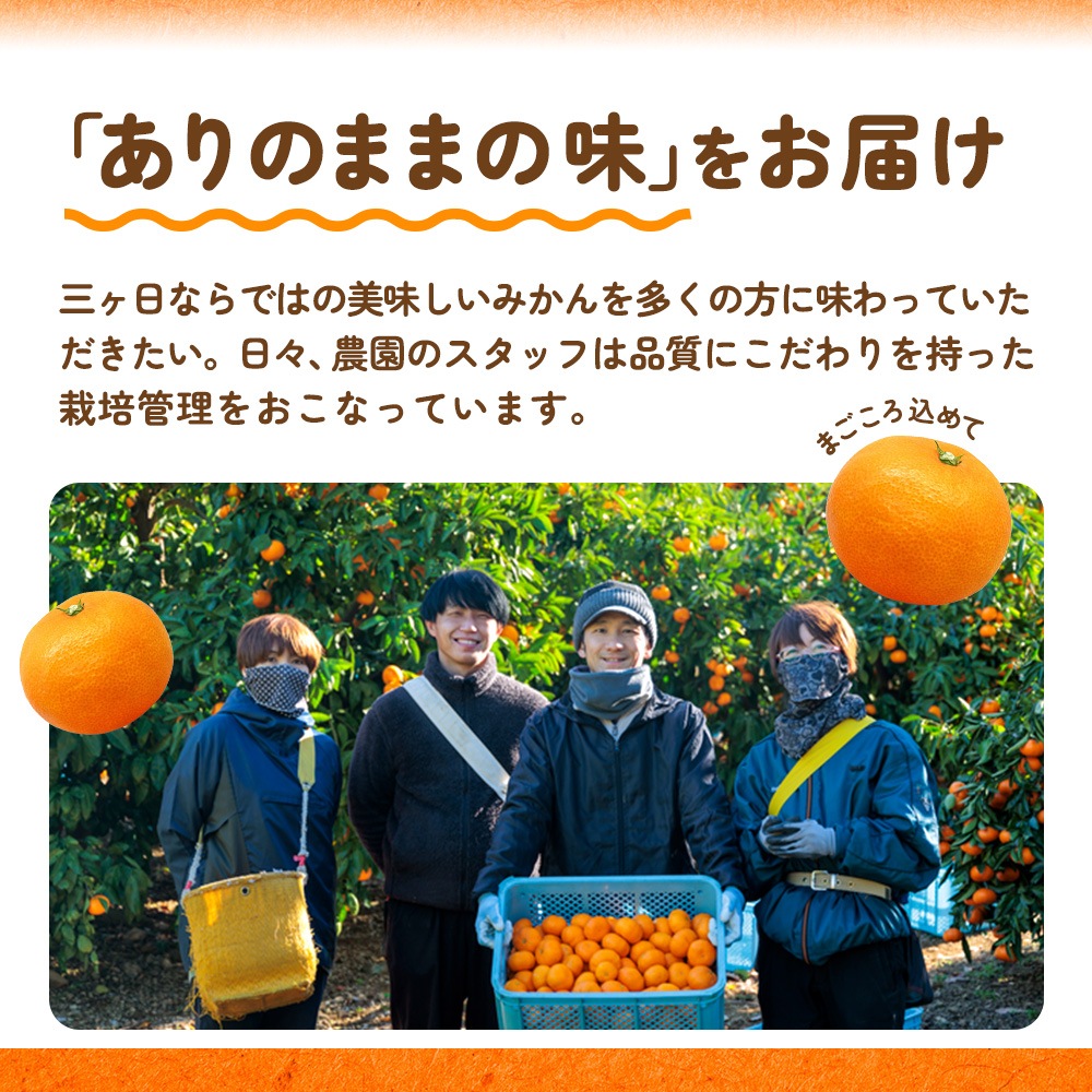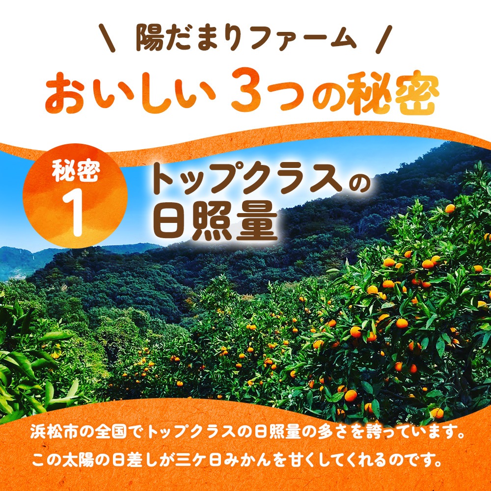 陽だまりファームからお届けする三ヶ日みかんは、静岡浜松市の恵まれた環境で育まれたみかんです。赤土の豊かな栄養分とトップクラスの日照量が生み出すみかんは、コクのある濃厚な甘味と絶妙な酸味のバランスが特徴。口にした瞬間、自然のおいしさを実感でき、ついつい手が伸びてしまうみかんです。三ヶ日ならではの美味しいみかんを多くの方に味わっていただきたい。日々、農園のスタッフは品質にこだわりを持った栽培管理をおこなっています。農園で働く私たちの想いがぎゅっと詰まった商品を一人でも多くの方にお届けしていきます。