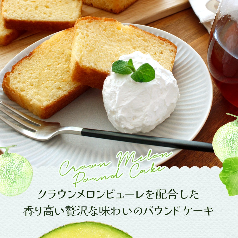 クラウンメロンピューレをたっぷりと贅沢に使用した香り高いパウンドケーキです。 ちょっと贅沢なおやつに。親しい方へのプレゼントに。