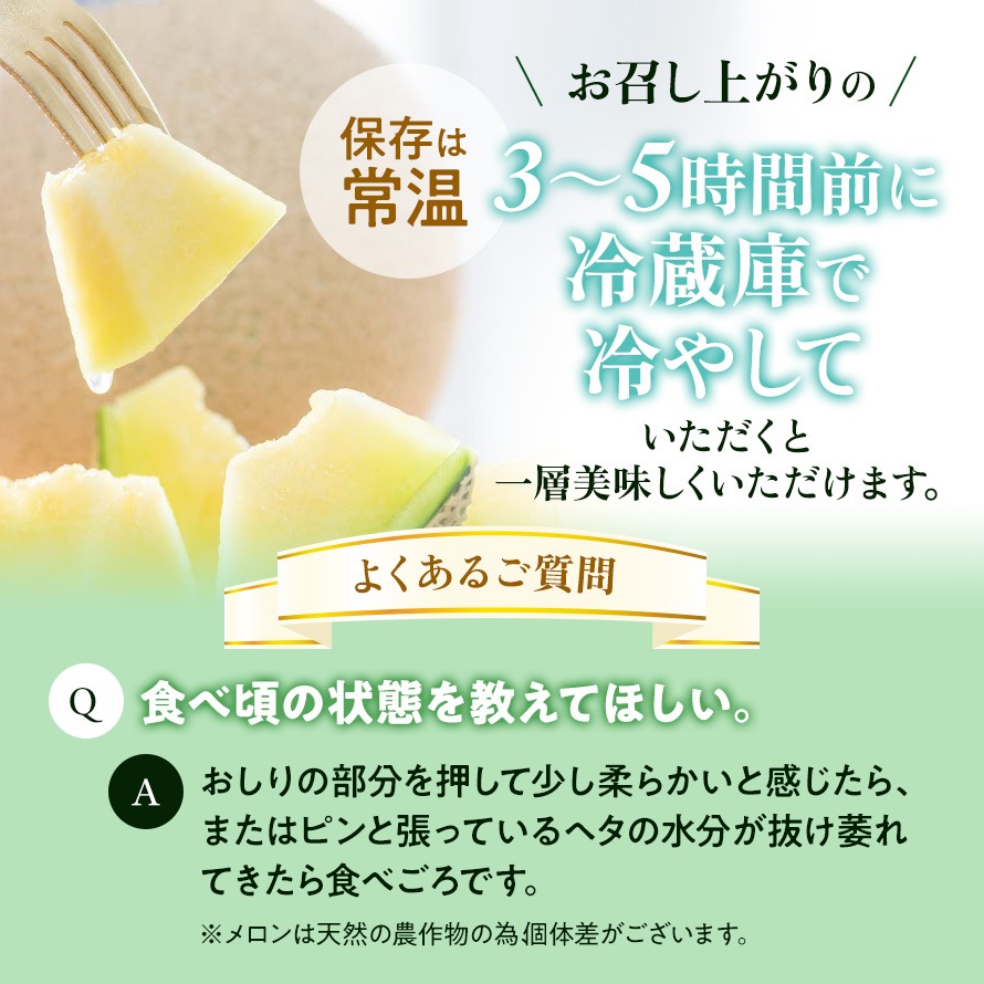 ※食べごろのメロンは柔らかく通常より割れやすいため、食べごろ当日や前日の到着は不可とさせていただきます。